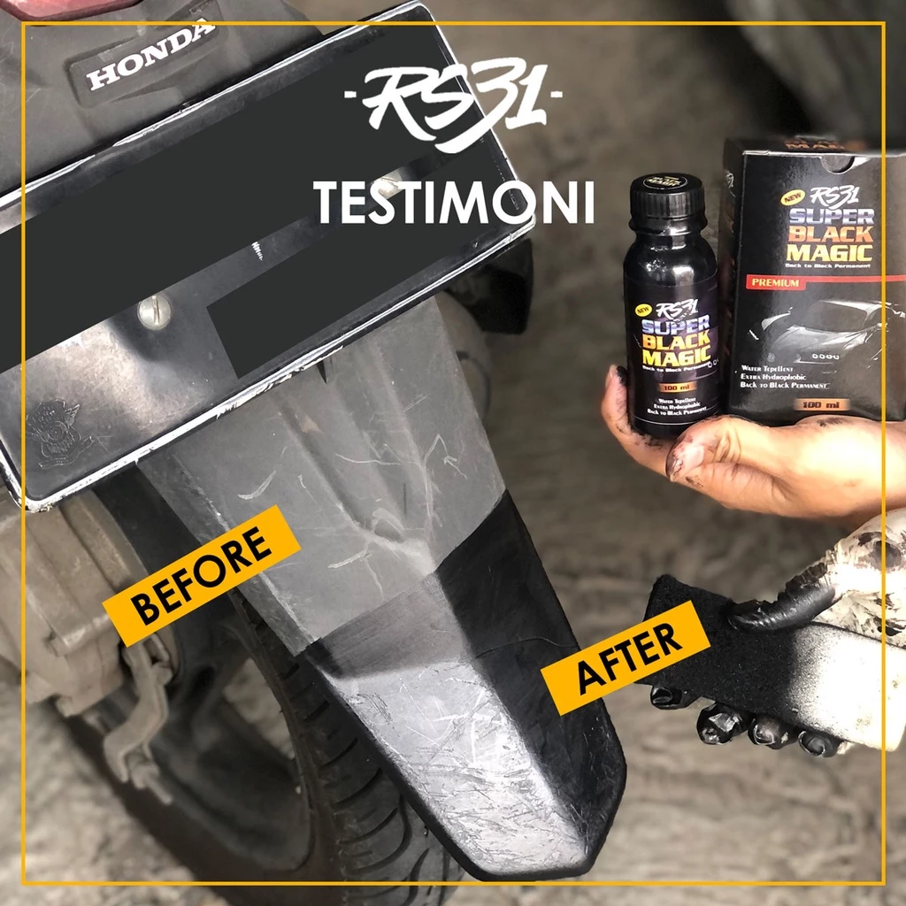 RS31 Super Black Magic adalah ramuan cairan khusus yg berfungsi untuk menghitamkan kembali plastik trim yang rusak, pudar, kusam, ataupun teroksidasi akibat paparan panas matahari, penggunaan silicon, sering dicuci, dll. RS31 Super Black Magic bersifat permanen dan hydropobic/efek daun talas. Bisa digunakan untuk spakbor plastik, dashboard, deck motor matic, tutup knalpot berbahan plastik, spion, gril, fender dan bagian exterior/interior lain yang terbuat dari plastik bertekstur